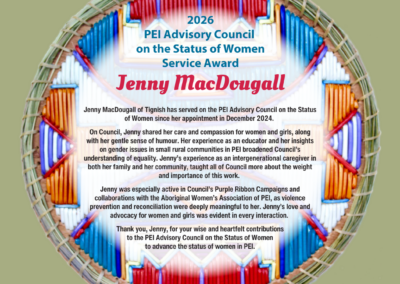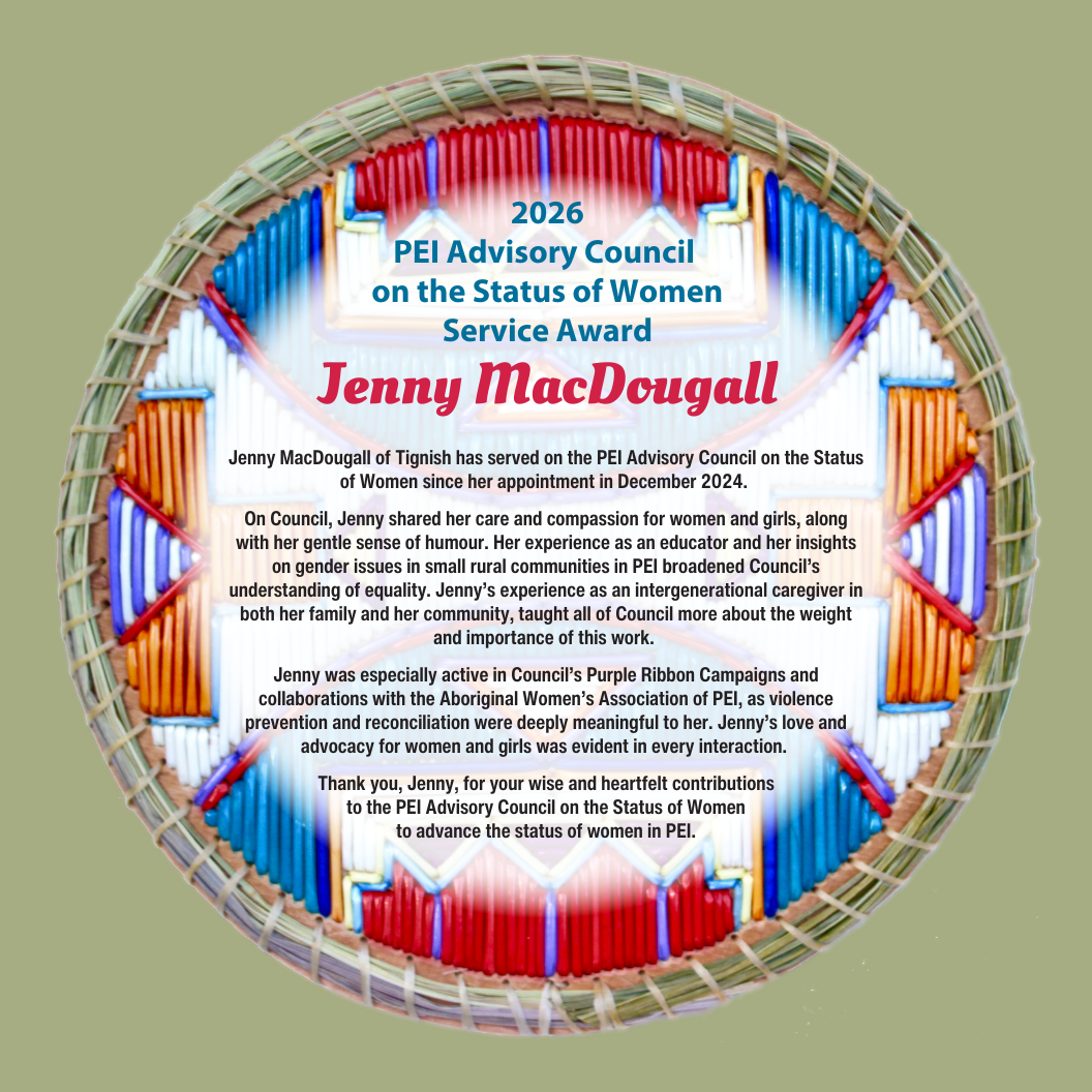We also missed the warm and loving presence of Council member Jenny MacDougall of Tignish. Jenny resigned her position recently, due to her many caregiving responsibilities. We are sad she is no longer able to participate on Council, as she brought such authentic presence and deep knowledge of rural PEI and the essential caregiving needs that women provide.