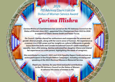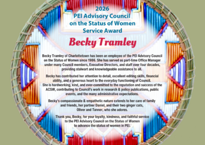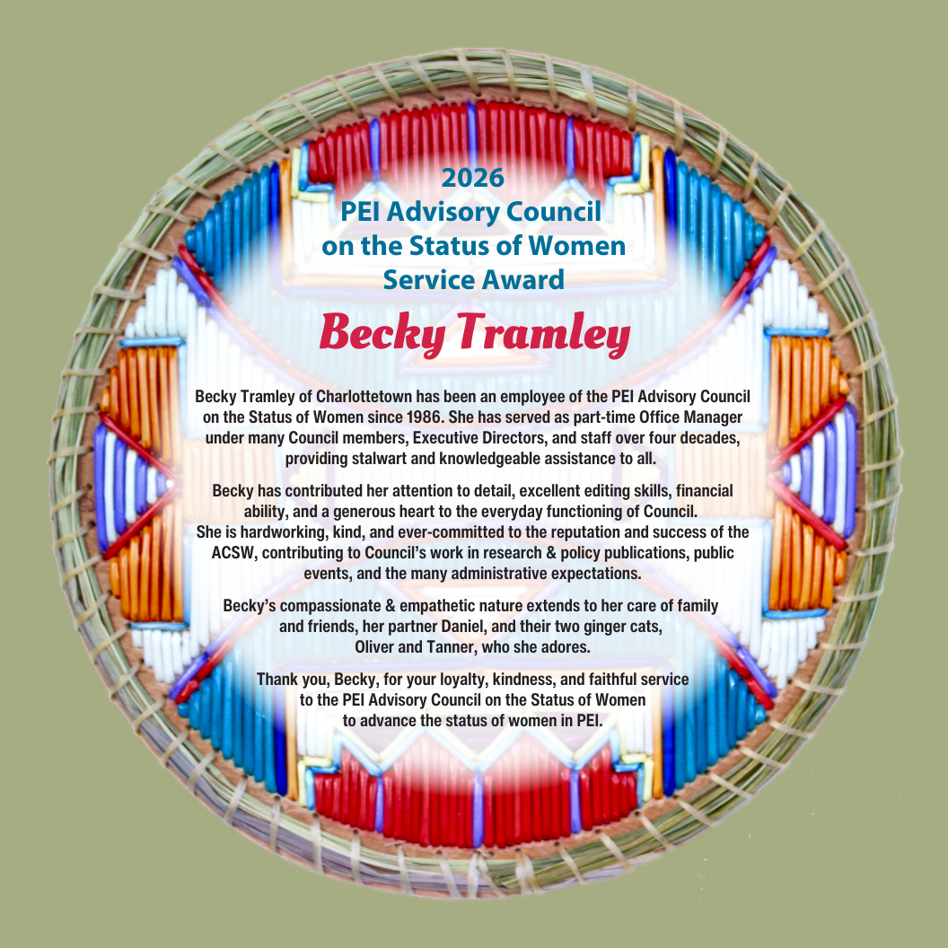 In mid April, Becky Tramley will be retiring after 40 years serving in office management and administrative support! A huge transition for her and for the Status of Women in PEI. We will surely miss her experience, her knowledge, her loyalty and her commitment.
